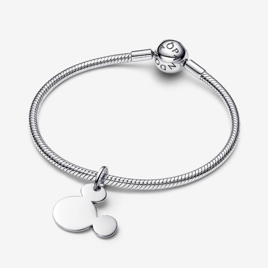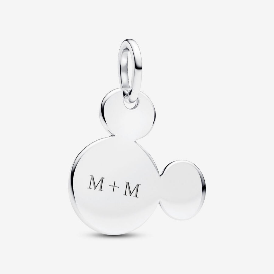 Apresentamos o primeiro pendente gravável Disney x Pandora, com a silhueta icónica do Mickey em prata.