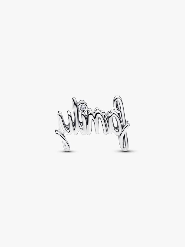 Um lembrete brilhante do que é mais importante. Esta conta de prata apresenta a inscrição "family" escrita à mão com um ponto de zircónias sobre o "i". De fabrico especializado, é um tributo intemporal ao coração de cada história.