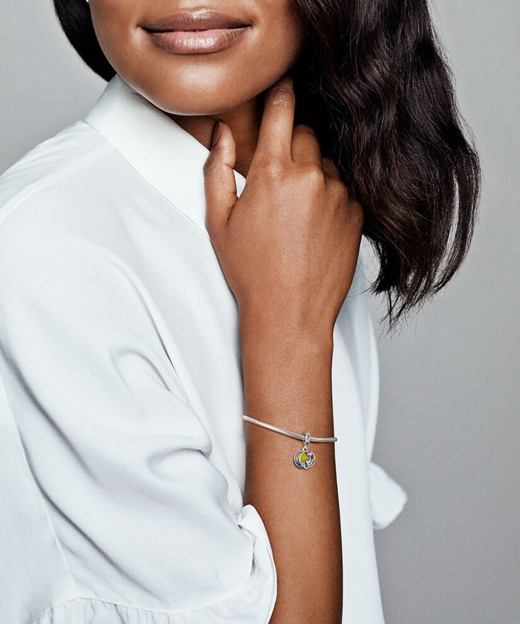 Celebre o Halloween com o Disney Nightmare Before Christmas Double Dangle Charm. Com acabamento manual em prata de primeira lei, o disco traseiro do design apresenta uma lua cheia e um céu noturno feitos com esmalte transparente aplicado à mão em amarelo e lavanda profunda. O disco frontal com orifícios inclui uma versão 3D da personagem principal, Jack Skellington da Disney. A fiança inclui uma decoração de teia de aranha, os logótipos da Disney e da Pandora e a gravação "What's this?". Junte esta peça a outros charms festivos para uma diversão verdadeiramente assustadora.