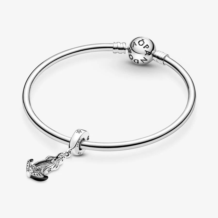 Mantenha a sua fé sempre presente com a Conta Pendente Virgem de Guadalupe. Esta conta de prata apresenta a Virgem, com as mãos apertadas, serena sobre uma lua crescente segurada por um anjo. O esmalte preto aplicado à mão acrescenta um toque marcante, com o manto decorado com pedras cintilantes cravadas em estrelas e micro-esferas no rebordo. A união apresenta uma pedra cravada numa estrela à frente, bem como corações gravados dos lados.