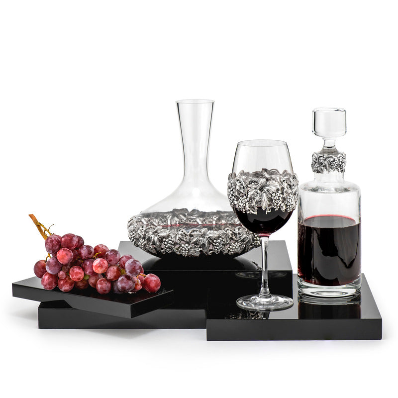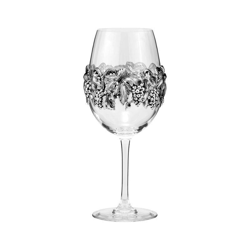 Copo de vinho em cristal e decoração em metal prateado. Coleção Uvas.