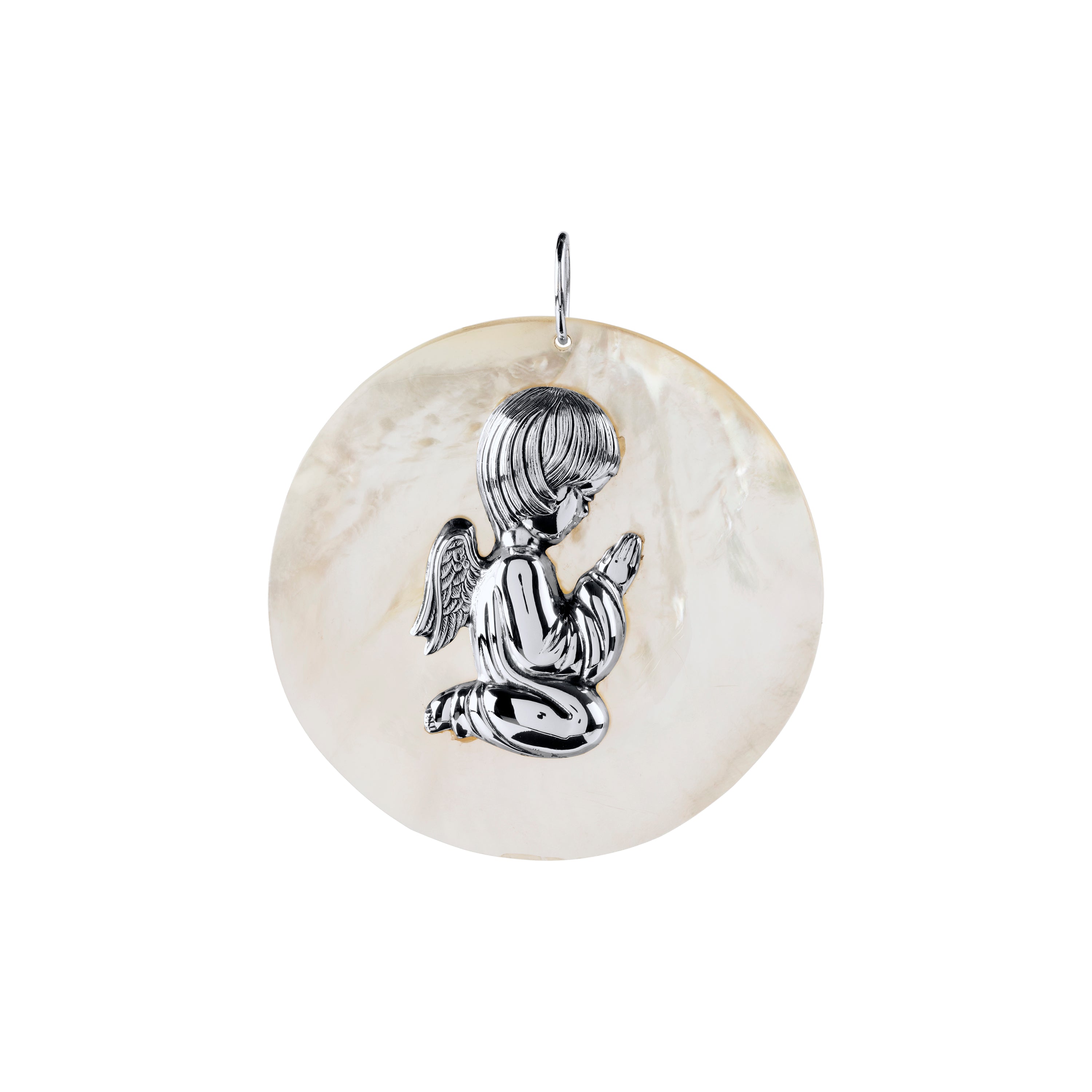 Berloque madreperola redondo com anjo Gabriel a rezar, em banho de prata, com 7,5cm de diâmetro. Sugestão: Ideal para ofertas de Comunhão e Baptizado.