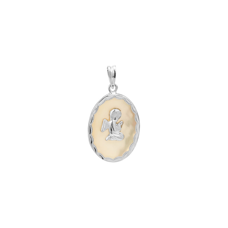 Medalha oval em prata, com madreperola e anjo Gabriel.