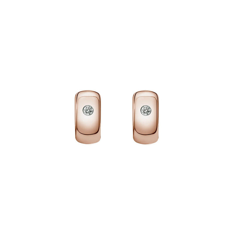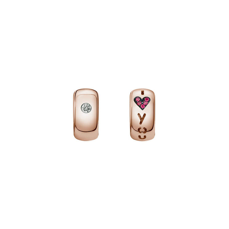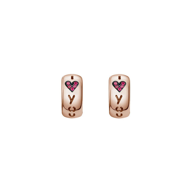 I Love You: Brincos em ouro rosa 19.2K com 2 diamantes lapidação brilhante com 0.20 ct. e 10 rubis com 0.10 ct. Diamantes: Cor G- Pureza VVS. Referência: BI2079A Peso: 14 g Dimensões dos brincos: 16.3 x 7.7 mm.