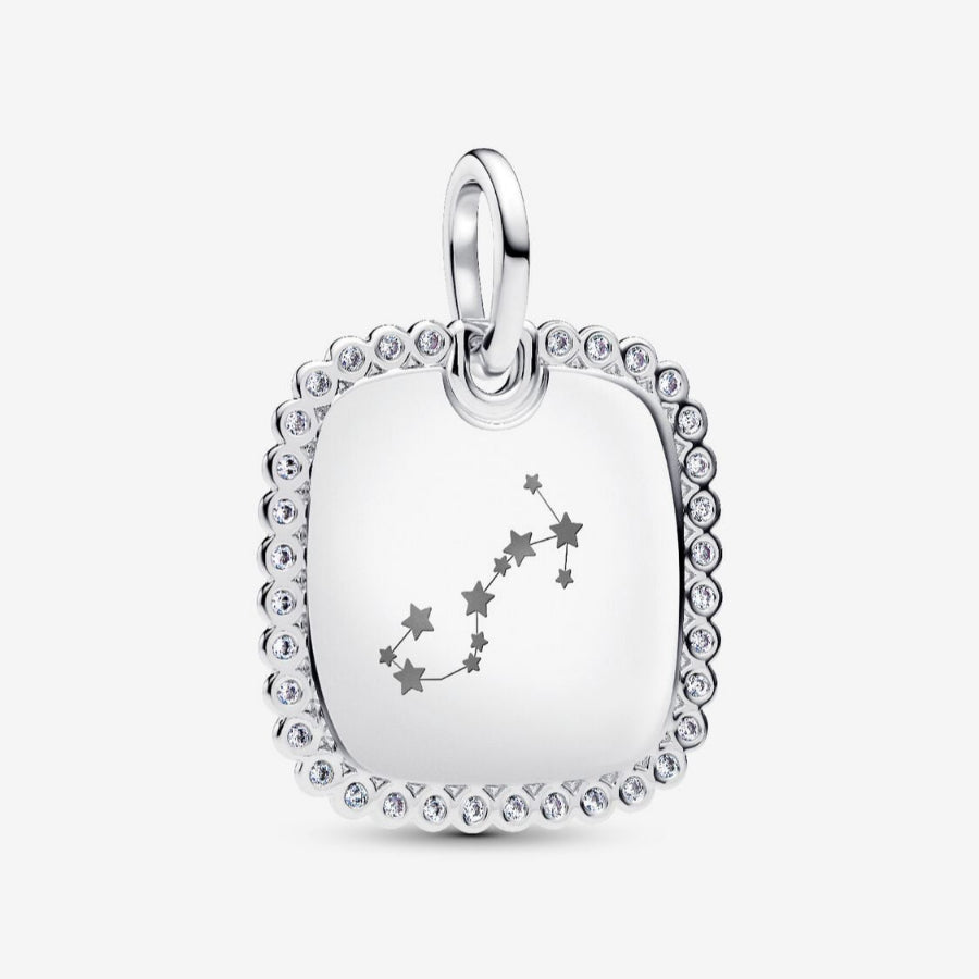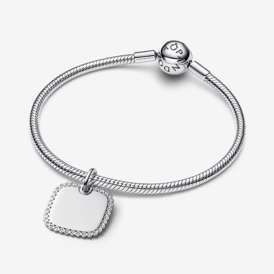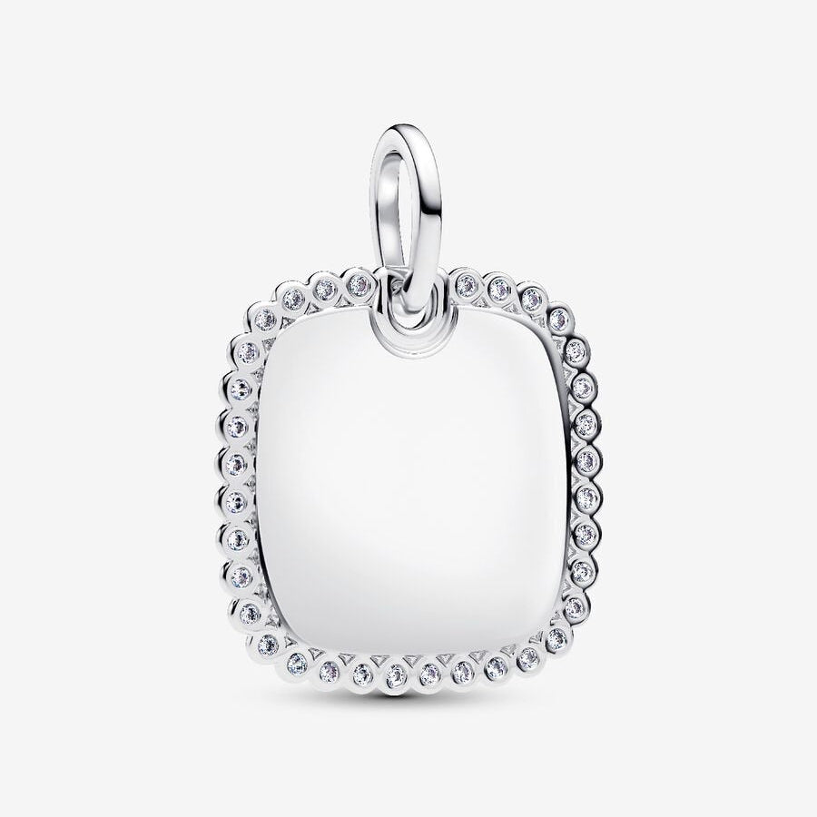Estilo minimalista que faz uma afirmação. Adicione à sua colecção o nosso pendente de disco quadrado gravável em prata, delineado com uma moldura de pedras cintilantes.