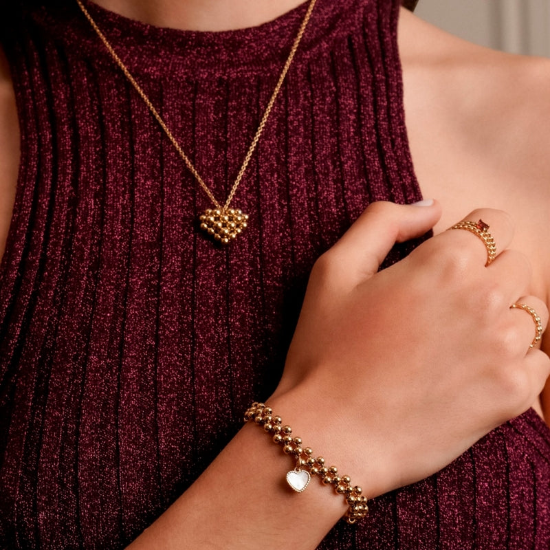 A pulseira Essence da coleção Arm Candy é uma peça marcante no pulso e que combina dois elementos muito românticos dentro da joalharia feminina: as esferas (contas) e o formato em coração.