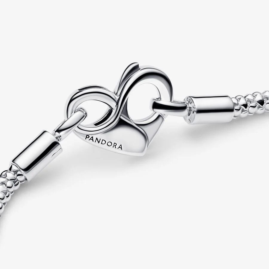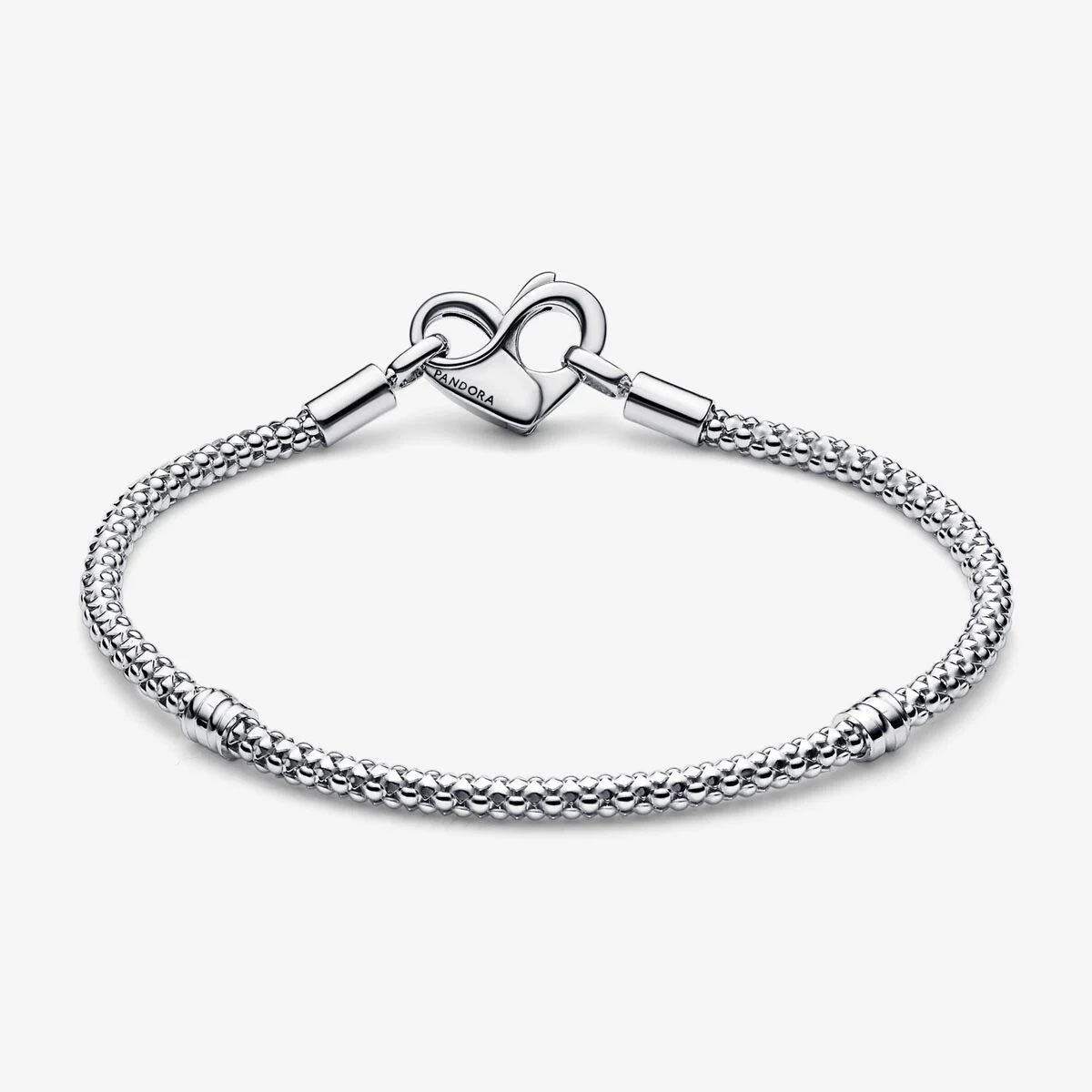 Actualize a sua colecção com a nossa nova Pulseira Moments Studded. Com acabamento manual em prata, esta pulseira apresenta uma corrente flexível texturada e um fecho em forma de coração de abrir com pormenores de infinito, com um símbolo do infinito no interior. Nota: pode ser colocado um máximo de 14-18 contas ou pendentes entre as três secções divididas pelas roscas.
