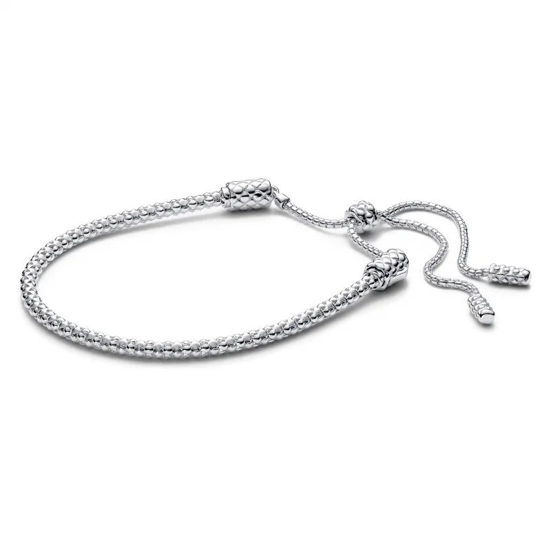Atualize a sua coleção com um ícone. Esta pulseira de prata apresenta uma corrente flexível e texturada com um padrão de tachas refletoras para um efeito camuflado único. Os terminais funcionais abrem-se com um clique para adicionar as suas contas, para um potencial de styling infinito.