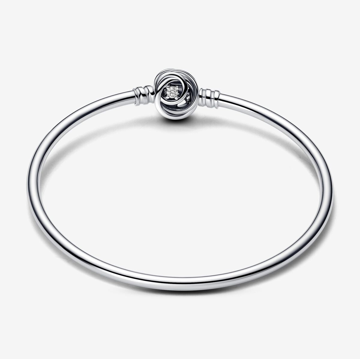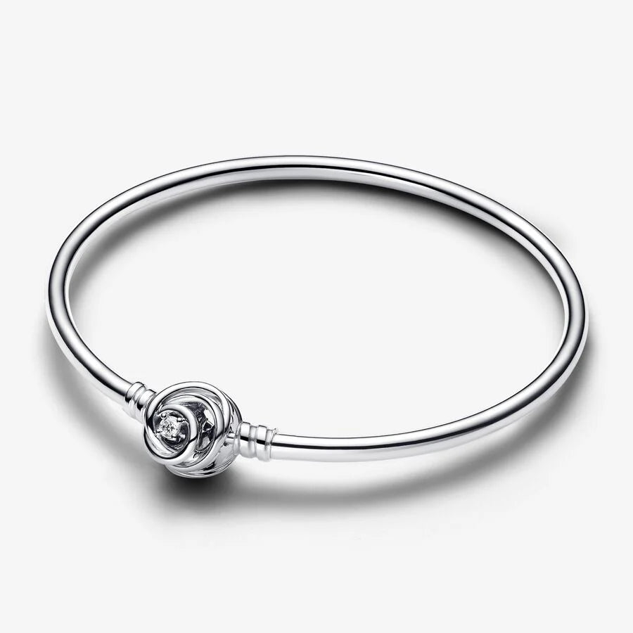 Celebre o poder do amor com a nossa Bangle Pandora Moments com fecho espiral uma peça statement e repleta de brilho, em prata. Com um fecho entrelaçado, a bangle é um símbolo de ligações infinitas. O design rendilhado do fecho, com linhas entrelaçadas de ambos os lados, é destacado por uma zircónia transparente e capta simbolicamente a essência da eternidade. Divertidamente versátil, pode conjugá-la com até 14-18 contas, celebrando os momentos mais importantes da sua vida. A Bangle tem roscas em ambas as extremidades, mantendo as suas contas seguras.