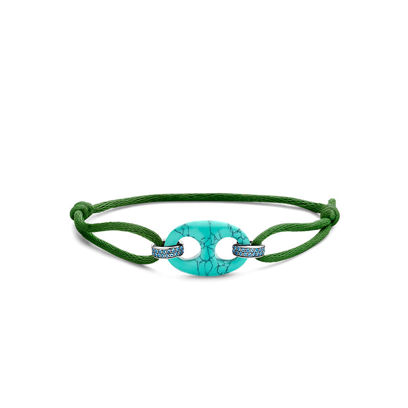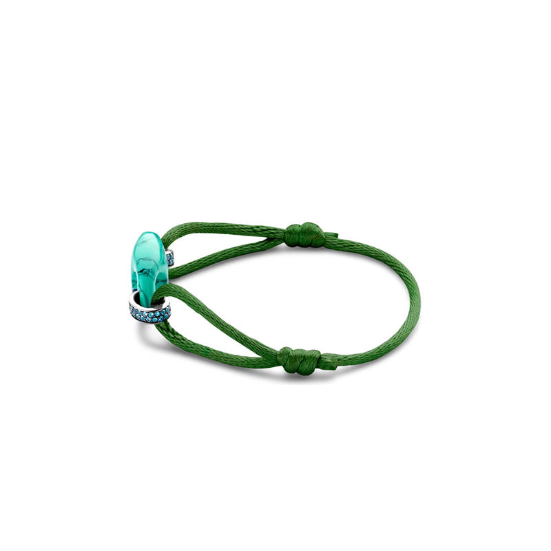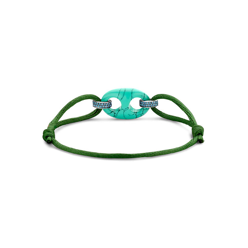 Esta pulseira de prata TI SENTO 2984TQ apresenta um símbolo de grão de café turquesa como peça central. Um cordão de seda verde malaquite é preso por dois elos prateados com um pavé de pedras de zircónia cúbica azul lápis-lazúli. A pulseira é confecionada em prata de lei 925. O seu formato clássico de grão de café foi redesenhado com um toque de ousadia lúdica. Embeleze os seus pulsos com a sua grande delicadeza.