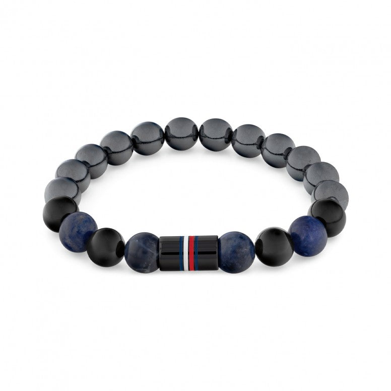 Pulseira masculina com contas de 10mm de pedras semipreciosas (Sodalite, Hematite e Ónix) em tons de azul, cinza e preto. Apresenta detalhes esmaltados que adicionam um toque moderno.