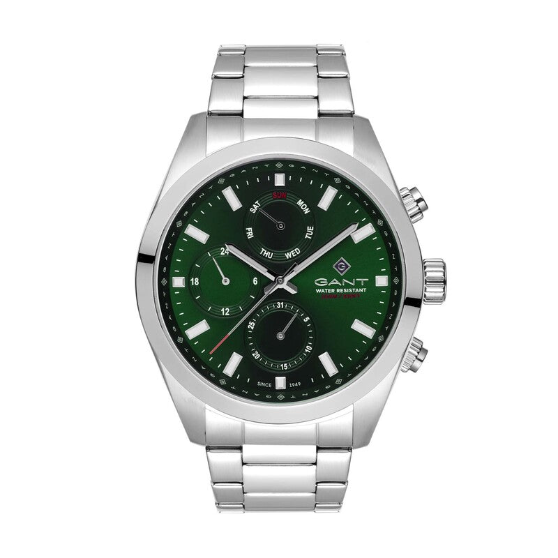 Descubra o elegante relógio prateado Gant Rochester com mostrador verde e bracelete de aço. Um acessório sofisticado para homens modernos.
