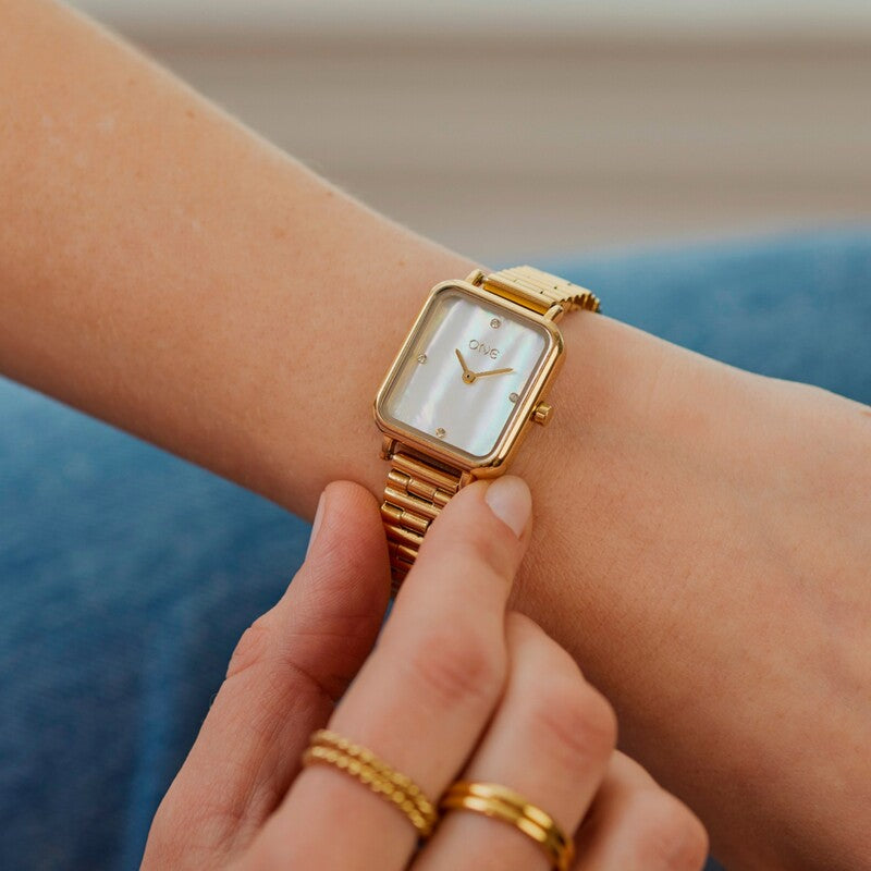 O relógio analógico Fame em dourado segue a tendência de caixas mais pequenas, criando um look mais elegante no pulso. De formato rectangular arredondado, a caixa dourada combina na perfeição com o mostrador em madrepérola e com os dois ponteiros (horas e minutos) também em dourado. O toque mais feminino deste modelo recai nos quatro pequenos cristais zircónia brancos que assinalam os quatro indexes (12h, 3h, 6h e 9h). A bracelete do relógio, fina e também dourada, é composta por elos estreitos, parecendo quase uma pulseira. Um modelo de relógio contemporâneo, discreto e com um toque de elegância.