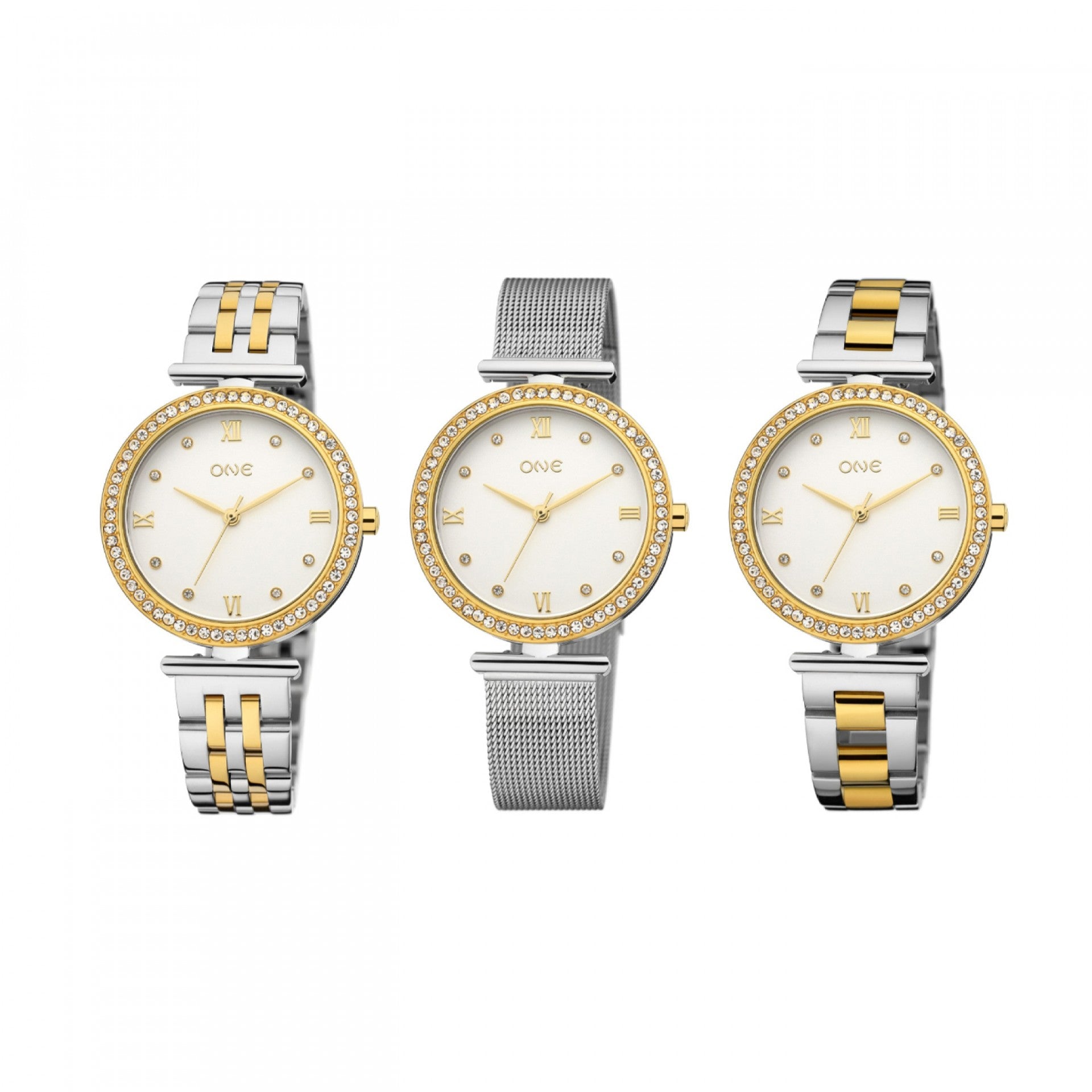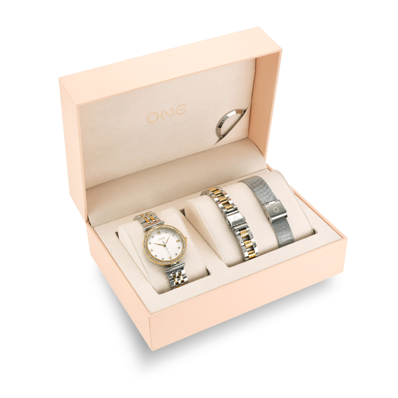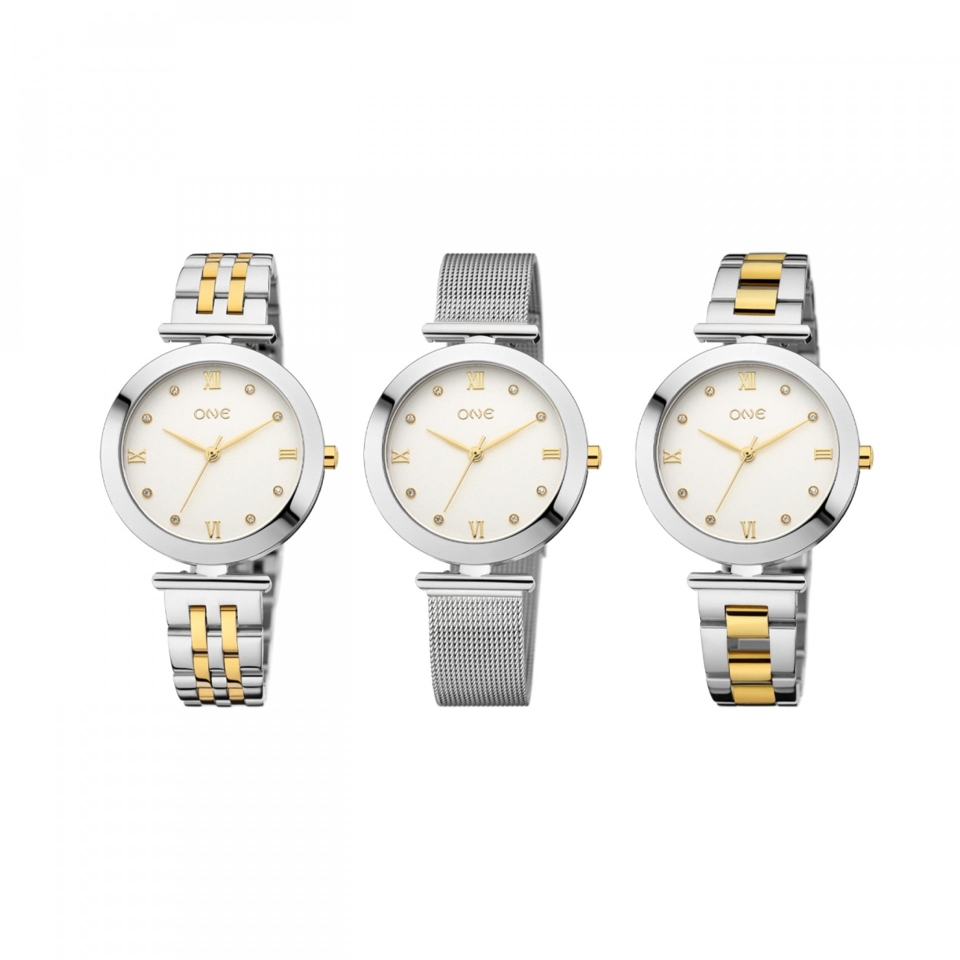 A Box One Desire é a escolha ideal para quem procura versatilidade, elegância e personalidade num só conjunto. Com um mostrador branco minimalista, o relógio apresenta três ponteiros dourados (horas, minutos e segundos) e índices cuidadosamente trabalhados: quatro números romanos em dourado e cristais brancos cravados a marcar as restantes horas, conferindo um brilho discreto e sofisticado ao pulso. O grande destaque desta box está na possibilidade de personalização: inclui dois aros intercambiáveis que transformam completamente o visual do relógio. Para um look elegante e intemporal, o aro prateado é a escolha ideal. Para quem prefere um toque de glamour, o aro dourado com cristais cravados por todo o contorno adiciona brilho e sofisticação ao conjunto. Mantendo o ADN das icónicas boxes One, esta edição apresenta duas braceletes distintas: uma bracelete bicolor em elos prateados e dourados e uma bracelete em malha prateada, que oferece leveza e conforto. Com a Box One Desire, um só relógio revela múltiplas facetas, adaptando-se perfeitamente a diferentes estilos, ocasiões e momentos.