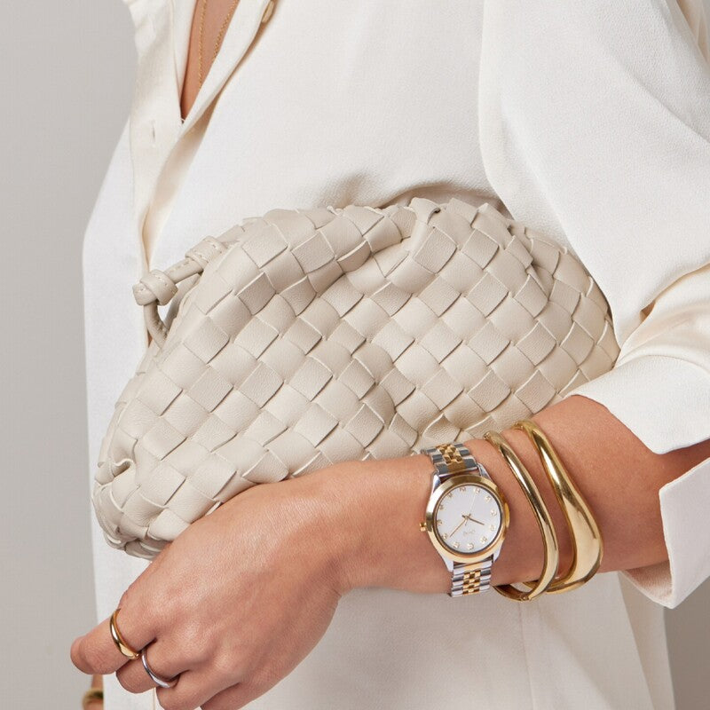 O relógio analógico Twin bicolor, destaca-se pelo seu design minimalista e sofisticado, ideal para os amantes do mix and match de metais. Com uma caixa redonda dourada e um mostrador branco, este modelo apresenta três ponteiros finos, horas e minutos em dourado, e segundos em prateado, em perfeita harmonia com a bracelete bicolor de cinco filas de elos, com as extremidades em prateado e as três filas centrais em dourado. O mostrador ganha um toque extra de luminosidade graças aos pequenos cristais zircónicas brancas cravados nos indexes em formato quadrado, conferindo elegância e brilho discreto à peça. Um relógio que combina simplicidade com detalhes luxuosos e uma sofisticada mistura de metais, perfeito para complementar looks do dia a dia ou ocasiões mais formais.