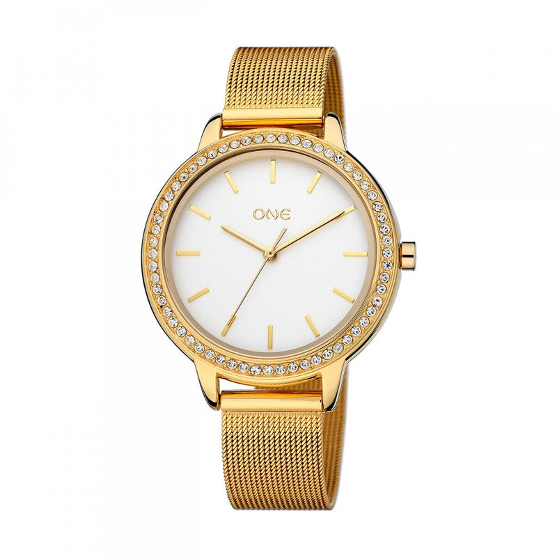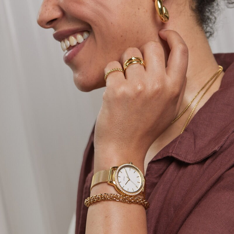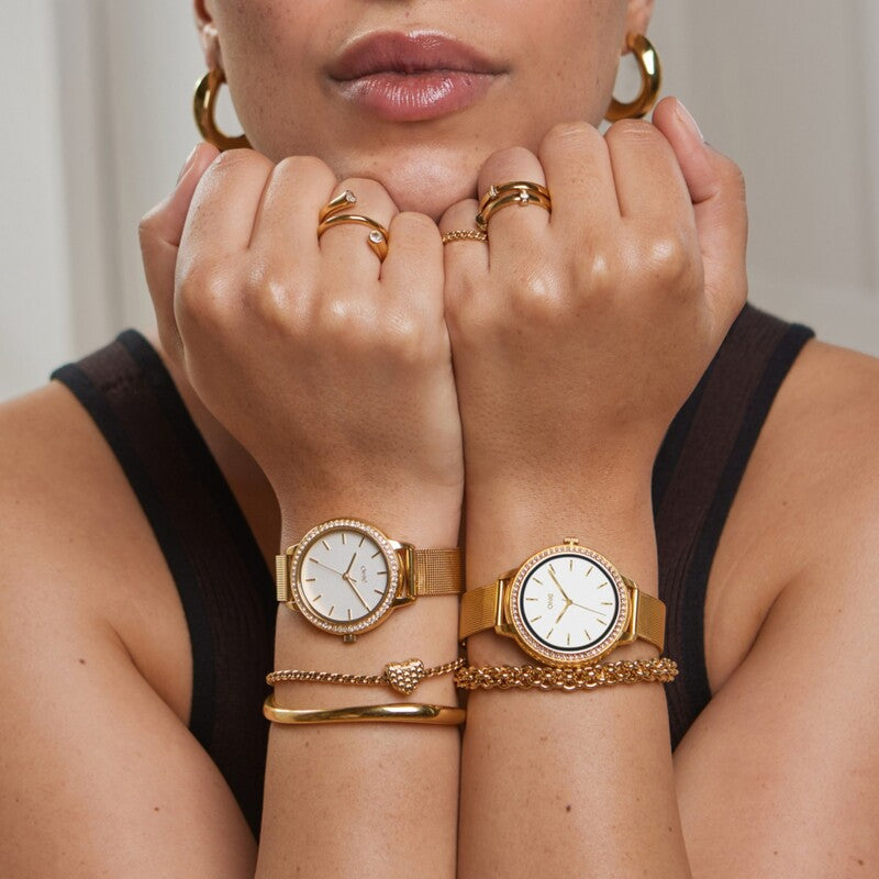 O relógio analógico Twin Spark em dourado apresenta um design feminino e elegante. Este modelo segue a tendência de caixas mais pequenas, em dourado e redondas. O seu mostrador tem um fundo em madrepérola, que lhe confere um toque mais romântico, e que é complementado pelos indexes finos em dourado. Conta ainda com um toque de glamour e luminosidade extra graças aos cristais brancos cravados na cabeça do relógio em torno do mostrador. Com uma fina bracelete em mesh igualmente dourada, que se ajusta facilmente a qualquer pulso graças ao fecho de ajuste rápido. Um relógio discreto no pulso mas repleto de pequenos detalhes que o tornam versátil para o dia-a-dia como para looks mais formais.