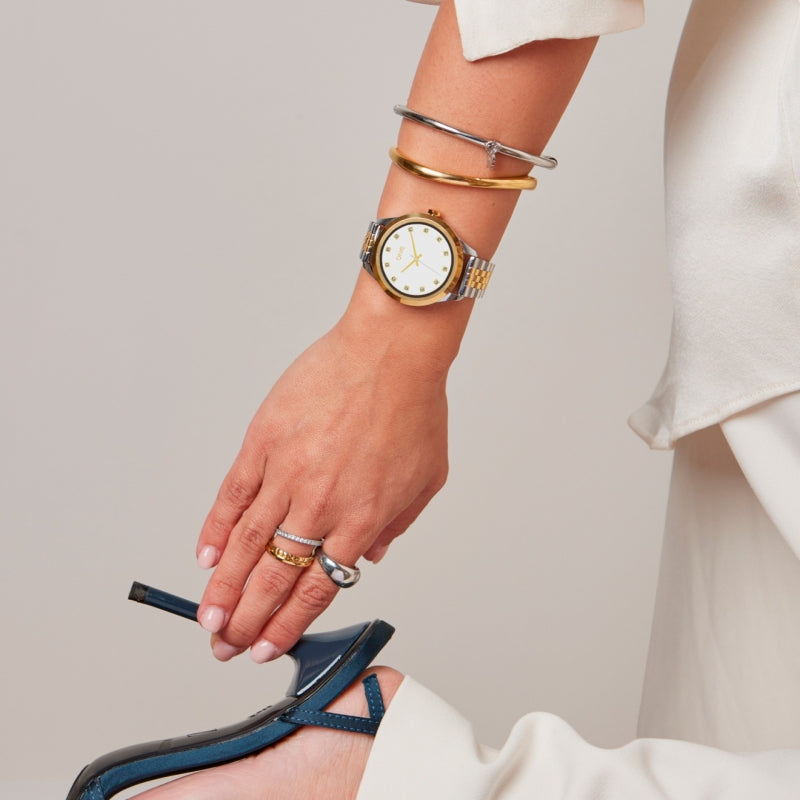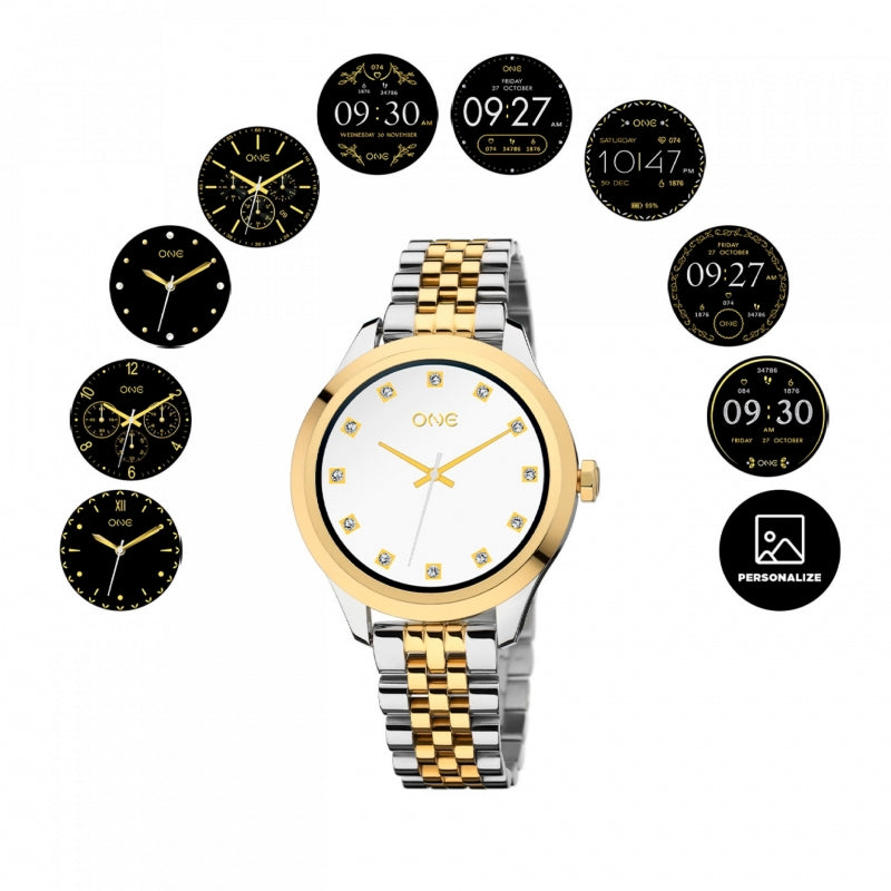 Mini Smartwatches, o tamanho importa, e a elegância também. O smartwatch Mini Bicolor, da geração 3, combina sofisticação e versatilidade num design compacto e atual. Com acabamento bicolor entre dourado e prateado e uma bracelete de elos metálicos, este modelo expressa uma elegância discreta com um toque urbano, ideal para complementar qualquer look. O ecrã AMOLED oferece uma visualização nítida, vibrante e fluida, garantindo uma experiência visual premium. O mostrador é totalmente personalizável, com 10 designs exclusivos com o ADN One, ou podes optar por utilizar qualquer imagem da galeria do teu telemóvel para um toque ainda mais pessoal. Compatível com a aplicação One Time Pro, o Mini Bicolor permite-te manter o controlo da tua rotina com funcionalidades como notificações, controlo de música, chamadas via Bluetooth, medição de saúde e muito mais, tudo com um simples toque no pulso. Este modelo não é compatível com braceletes avulsas à venda no site. Para quem procura um smartwatch com funcionalidade, conectividade e estilo num formato mini, o Mini Bicolor é a escolha ideal.