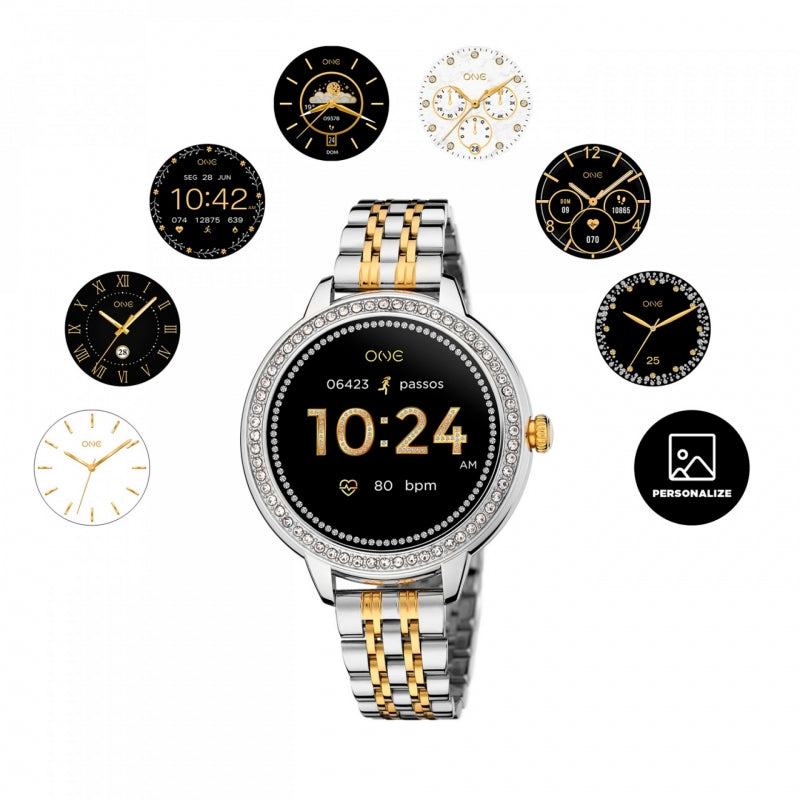 Mini Smartwatches, o tamanho importa, e a elegância também. O smartwatch Mini Spark Bicolor, da geração 3, destaca-se pelo seu design arrojado e sofisticado, seguindo a tendência mix & match entre o dourado e o prateado. O mostrador redondo prateado com detalhe em cristais zircónias brancas combina na perfeição com a bracelete de elos metálicos bicolor, reforçando o caráter urbano e feminino desta peça única. Equipado com ecrã AMOLED, oferece uma experiência visual mais nítida, brilhante e envolvente. O mostrador é totalmente personalizável com 8 designs exclusivos com ADN One, ou, se preferires, podes usar qualquer imagem da galeria do teu telemóvel para um toque ainda mais pessoal. Compatível com a aplicação One Smart, este modelo garante acesso a todas as funcionalidades essenciais do teu dia-a-dia, incluindo notificações, controlo de música, medição de saúde e função de chamadas via Bluetooth, mantendo-te ligada de forma prática e discreta. Este modelo não é compatível com braceletes avulsas à venda no site. Para quem procura funcionalidade, conectividade e sofisticação em tamanho compacto, o Mini Spark Bicolor é a escolha certa.