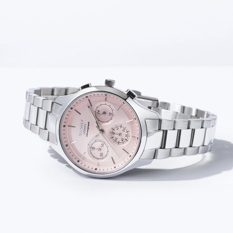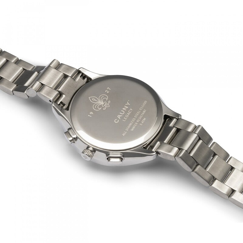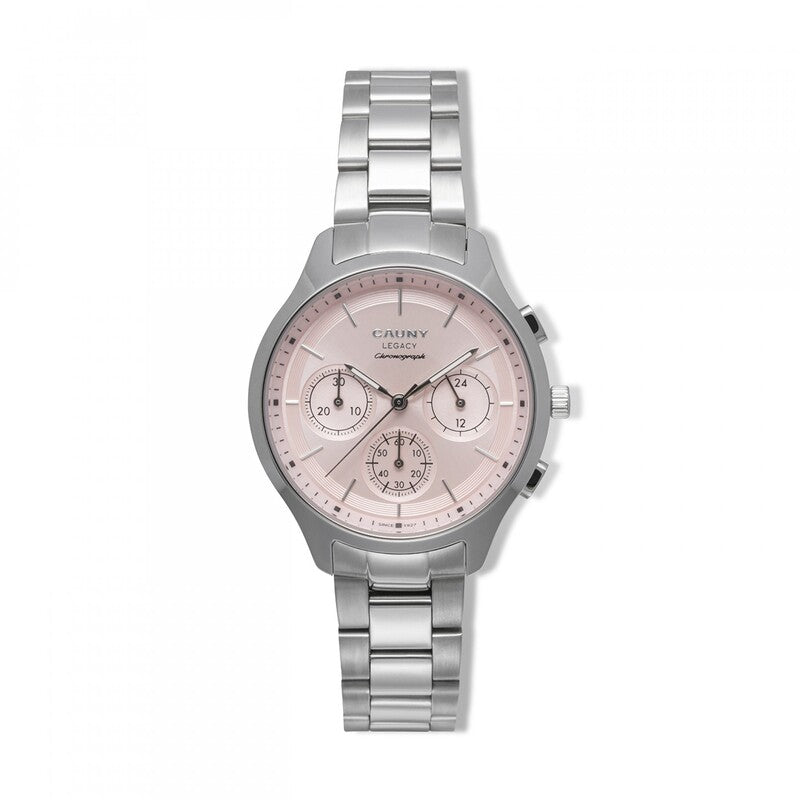 A palavra cronógrafo vem do grego chronos (tempo) e graphein (escrever) e significa escrever no tempo. Com três contadores e botões laterais tradicionais, este elegante cronógrafo combina com qualquer visual graças à sua pulseira de aço sólido em ouro rosa, que lhe dá versatilidade, e à combinação sofisticada do mostrador branco com detalhes em ouro rosa. Um best-seller da Cauny e um relógio que você nunca vai querer tirar do seu pulso.