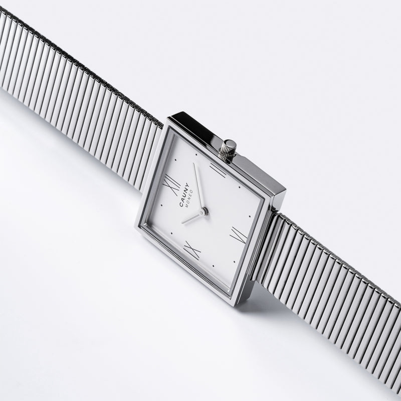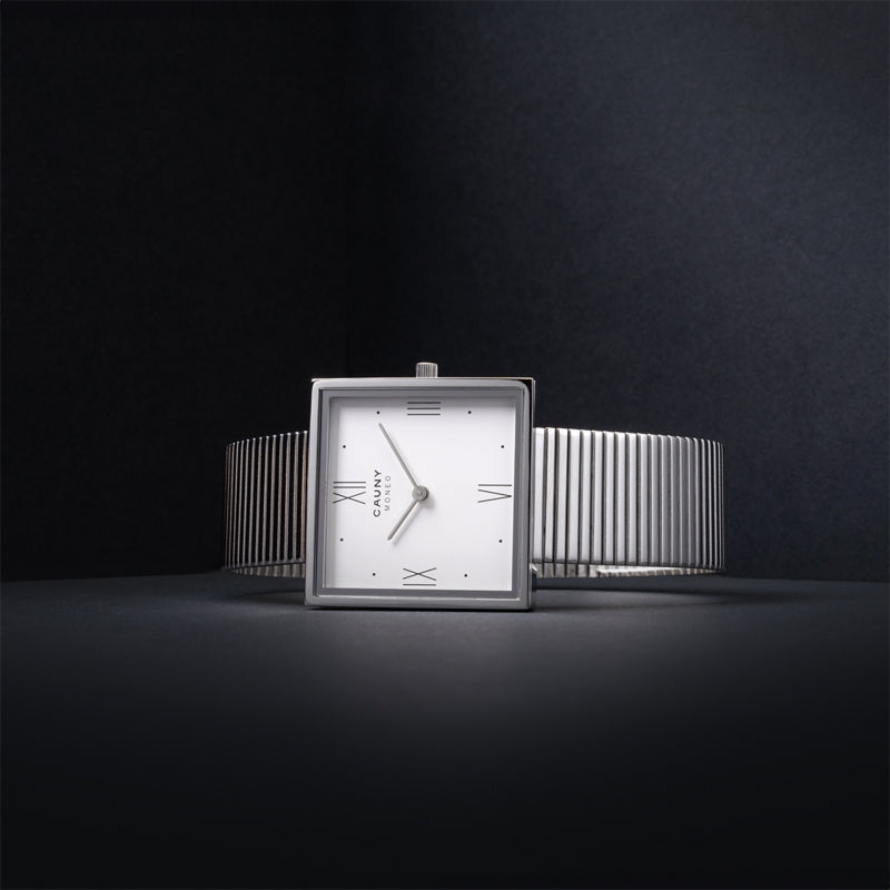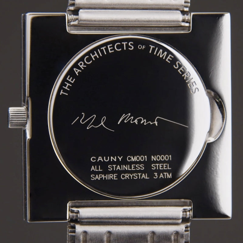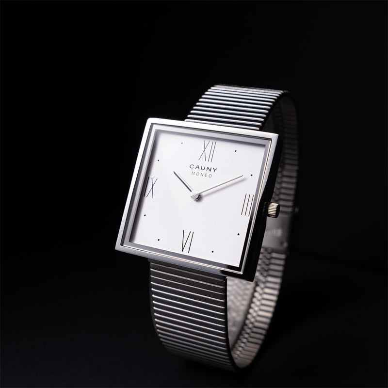 Ao desenhar o seu primeiro relógio de pulso, Rafael Moneo partiu dos relógios que desenhara para as torres de Logronho e da Estação de Atocha, em Madrid. Para alcançar o quadrado perfeito, optou no seu desenho por um sistema surpreendente de ligação à bracelete no próprio interior do relógio. Os números romanos são altos e finíssimos, evocam os antigos relógios de sol e marcam fortemente um mostrador que se distingue pela simplicidade e pelo equilíbrio. Os ponteiros incorporam as linhas rectas que definem todo o conjunto.