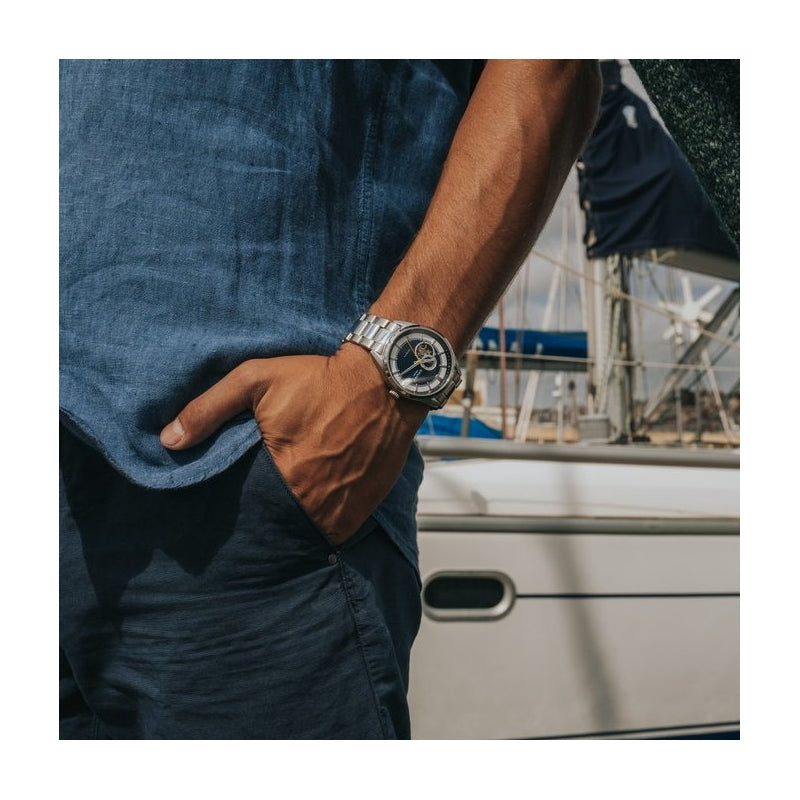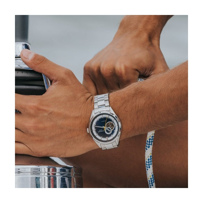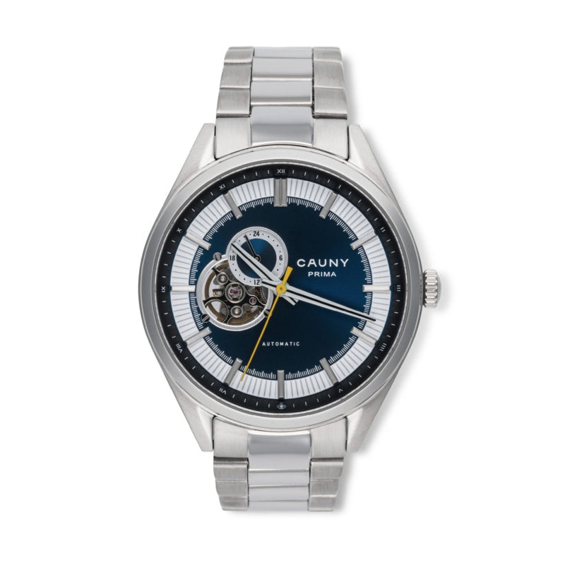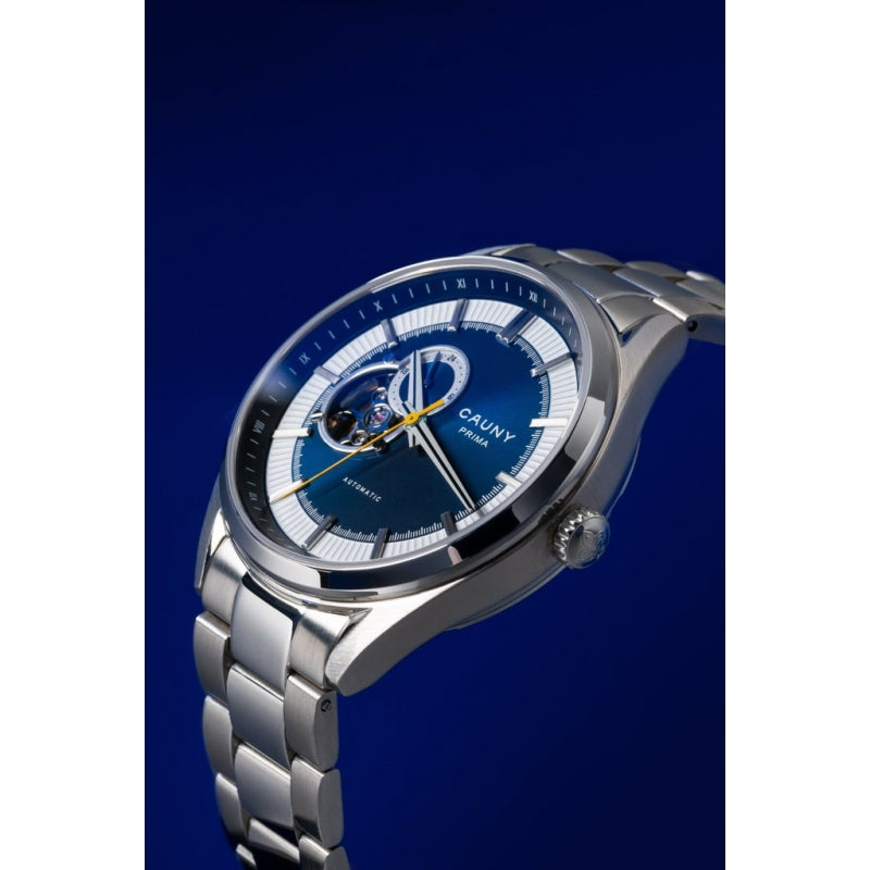 Robusto e imponente, o Cauny Prima Open Heart Steel Blue é o primeiro relógio automático da Cauny com uma bracelete em aço sólido de alta precisão. Concebido para equilibrar elementos tradicionais com um espírito irreverente, este relógio tem um mostrador azul, reminescente do ADN marítimo da Cauny, através do qual pode observar o mecanismo automático em movimento graças a uma elegante abertura Open Heart. Descubra o engenho de um relógio automático com um estilo moderno com o modelo Cauny Prima Open Heart Steel Blue.