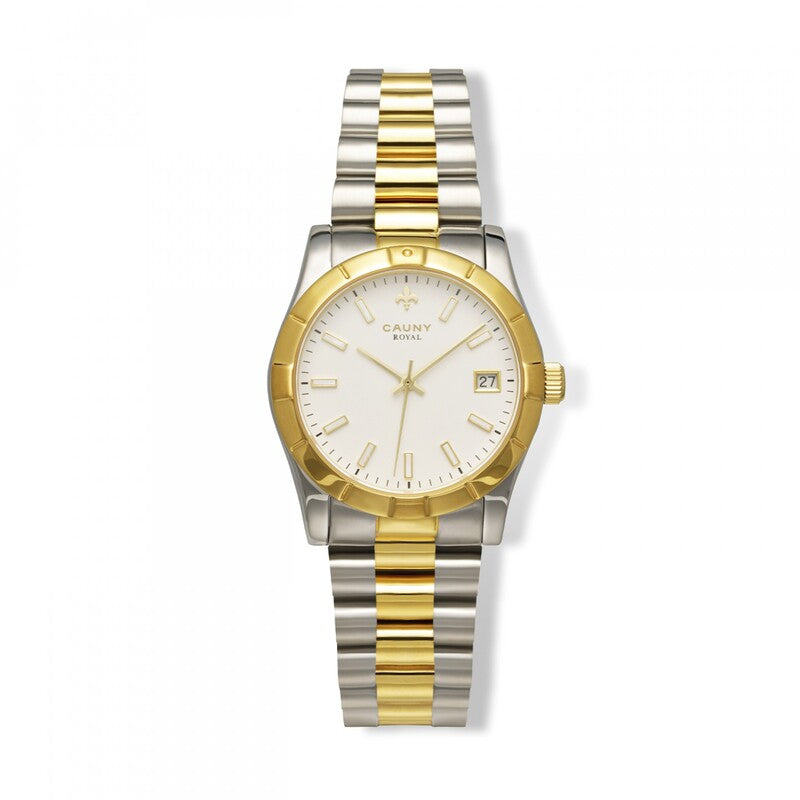 Com a Flor-de-Lis da Cauny embutida no mostrador, índices com o interior em madrepérola, pulseira em aço e proporções moderadas, o Cauny Royal é o acessório perfeito da mulher moderna. Esta versão combina um mostrador branco com uma bracelete e caixa bicolor, oferecendo um pouco de flair a um relógio clássico.
