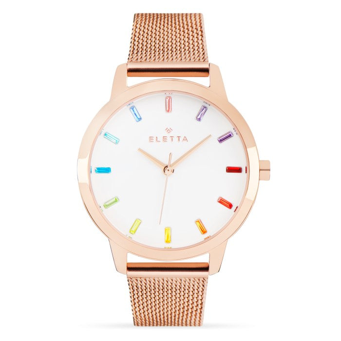 Chegou o arco-íris! Os relógios da linha Rainbow da Eletta surgem como uma coleção trendy e divertida de Verão, adaptável a qualquer situação do dia-a-dia mas sempre adequados a qualquer estação do ano. Com caixa em aço de 36mm, mostrador branco e indexes em cristais coloridos, os modelos desta linha garantem que estarás sempre na moda. Este modelo em aço dourado rosa inclui uma bracelete em aço de malha milanesa dourado rosa de 16mm, e uma bracelete em pele branca extra de oferta