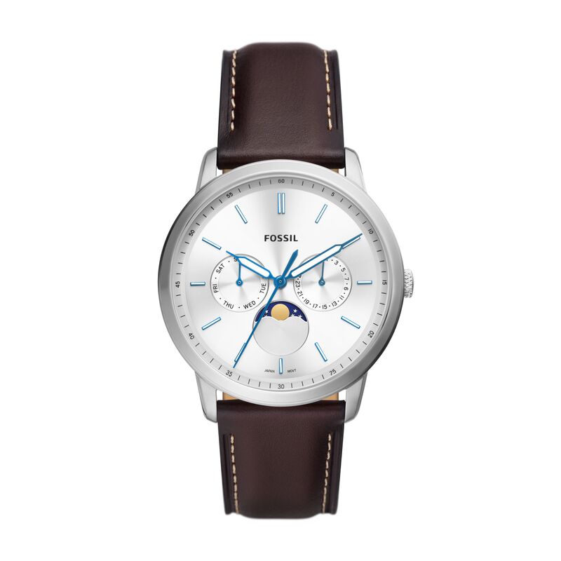 Este Neutra Moonphase de 42 mm apresenta um mostrador com efeito sunray, movimento multifunções moonphase e bracelete em pele castanha.