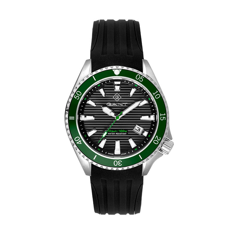 O relógio Gant Waterville é um relógio analógico de homem, com mostrador preto de 45 mm e bracelete em silicone.