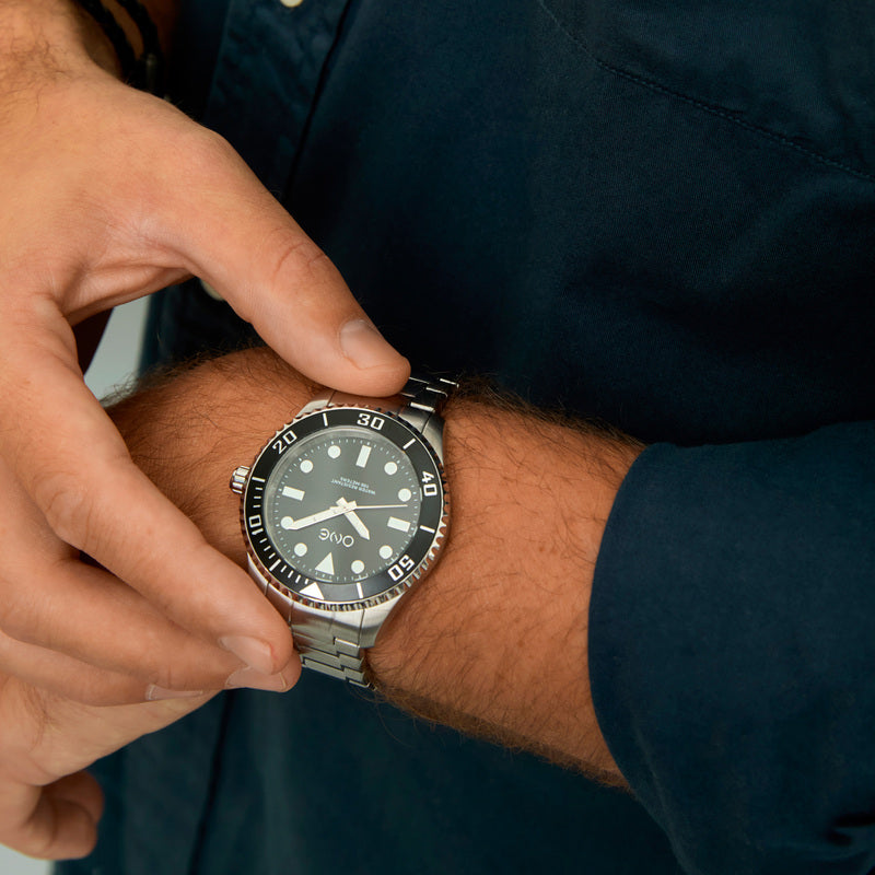 O relógio analógico Hydra em preto é um relógio que combina um estilo mais desportivo com elementos contemporâneos resultando num design robusto e sofisticado. Este relógio, de linhas marcadamente masculinas, apresenta um mostrador redondo e preto onde se destacam os três ponteiros (horas, minutos e segundos) a branco, as várias formas geométricas no lugar dos indexes complementado pelos números também a branco na coroa preta e giratória do relógio. A bracelete em aço de elos prateada pode ser ajustada para que se adapte da melhor forma do pulso de quem o usa. Resistência à água 10 ATM.