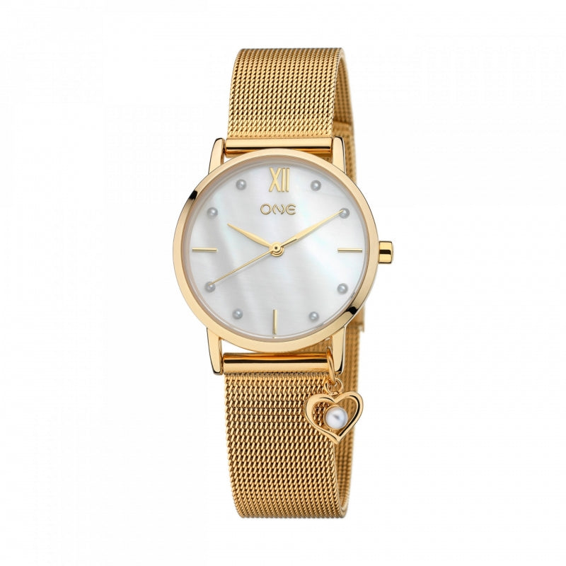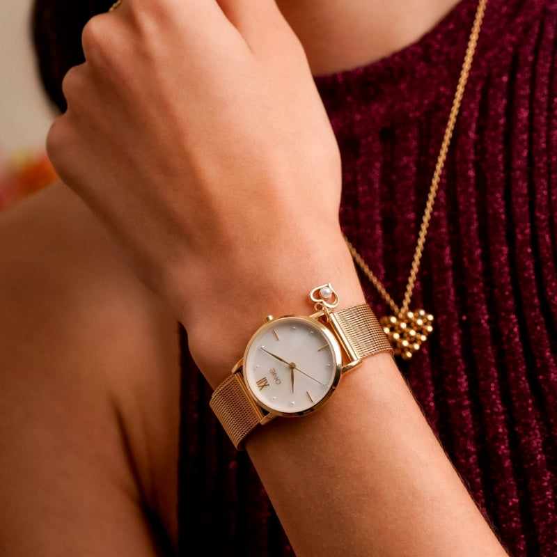 O relógio analógico Truly Gold é uma peça delicada e romântica que segue a tendência de caixas redondas mais pequenas no pulso. O relógio tem um mostrador em madrepérola, complementado por oito pequenas pérolas nos indexes 1, 2, 4, 5, 7, 8, 10 e 11, onde se realçam os três ponteiros (horas, minutos e segundos) e indexes 12, 3, 6 e 9 também dourados. Na bracelete dourada em mesh está pousado um pequeno pendente com o formato de um coração, também em dourado com uma pequena pérola no centro. O relógio tem resistência à água de 3 ATM.