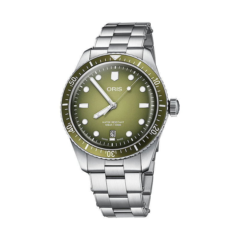 Este Divers Sixty-Five é inspirado nas tonalidades verdes naturais das florestas que circundam a sede da Oris em Hölstein, nas profundezas do vale de Waldenburg. O mostrador verde em degradê surge numa caixa de aço inoxidável de 40 mm, com uma bracelete metálica de três elos.
