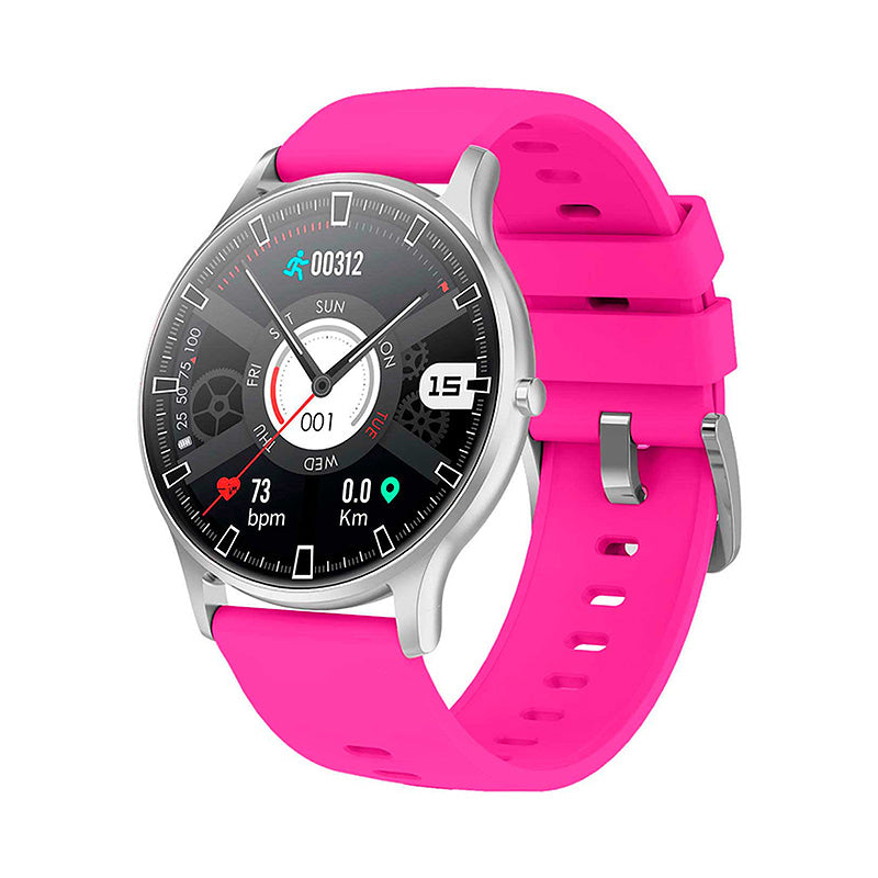 Smartwatch Radiant® RAS21005 criado para mulher. Um relógio inteligente da coleção Radiant Miami incorporam as últimas novidades no mercado. Funcionalidade e elegância em 5 modelos de diferentes cores repletos de aplicações de saúde, sono e 24 modos de desporto. Ecrã redondo de alta resolução permite uma grande facilidade no uso. Controla um leitor de música intuitivo através de Bluetooth. Todos os modelos incorporam a funcionalidade de visualizar chamadas em curso. A duração aproximada da bateria do relógio é de 4 a 7 dias em utilização normal, e de 15 dias em modo Standby. Carrega-se através de cabo USB. Este Radiant® Smartwatch RAS21005 Miami conta com um ecrã multicolor de grande formato e que oferece uma visualização perfeita de toda a informação, além de permitir personalizar o fundo com a imagem ou foto que desejar. Bracelete em silicone rosa choque em sintonia com a caixa prateada. Uso confortável no pulso, leve tornando este smartwatch perfeito para todas as atividades. Radiant Smartwatch RAS21005 Miami smartwatch de mulher apresenta-se com uma cor predominantemente rosa ideal para a prática desportiva ou uso casual.