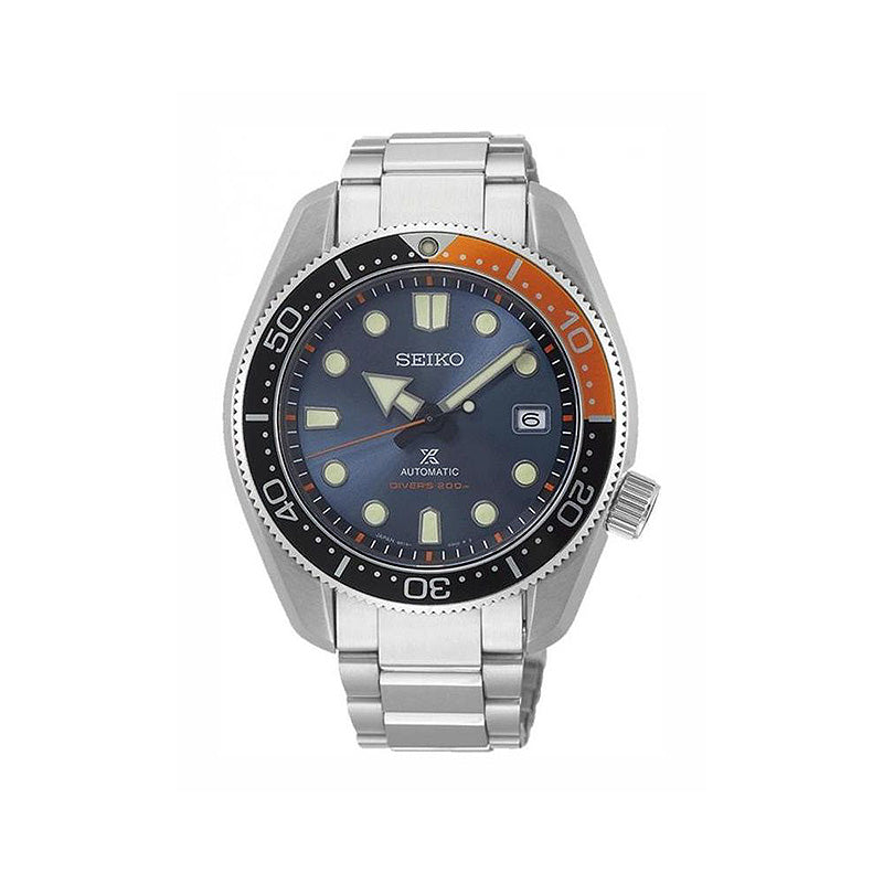 Relógio masculino Seiko SPB097J1 "Prospex Diver's 6R" "Twilight Blue" ". Caixa em aço com 44 mm de diâmetro. Bracelete em aço. Mostrador azul. Moldura laranja preta. Calendário. 200m à prova d'água.