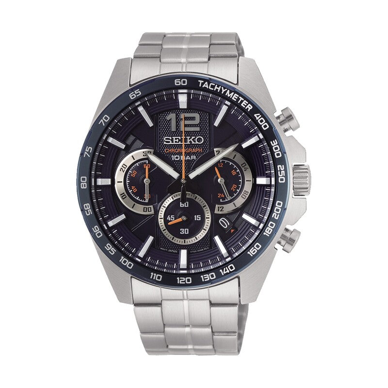 Este cronógrafo apelativo representa na perfeição o espírito da linha Neo Sports. Totalmente criado em aço inoxidável e resistente à água até 10 bars, este relógio vai acompanhá-lo diariamente por muitos anos. O seu desenho desportivo é realçado pelo bisel com taquímetro, e pelo LumiBrite que cobre os ponteiros e os índices, alimentados pela alta-precisão dos movimentos de quartzo da Seiko.