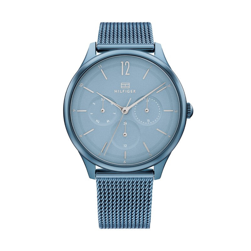 Relógio elegante de linhas intemporais em aço com caixa de 38 mm de diâmetro, com mostrador azul
