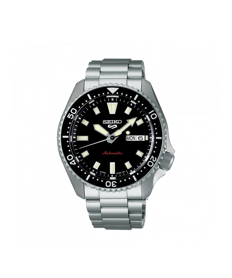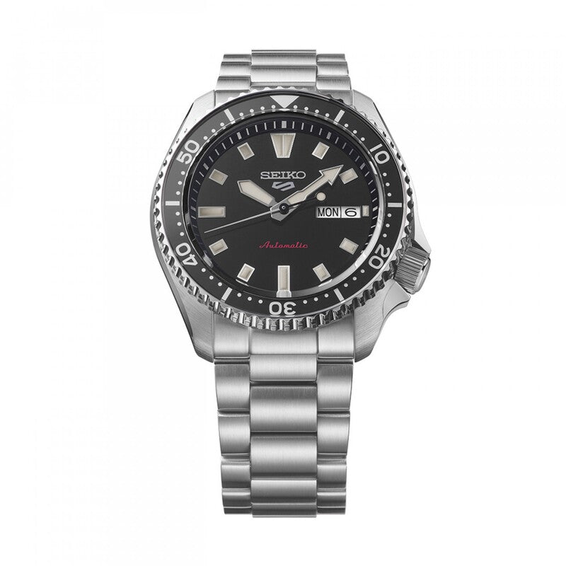 Relógio Seiko 5 Sports Field Series - SRPL85K1 analógico com data para homem, com caixa de aço prateado, mostrador preto e bracelete em aço prateado.