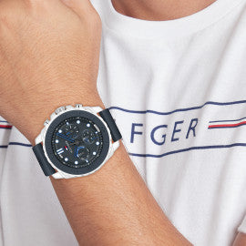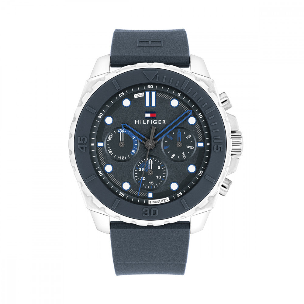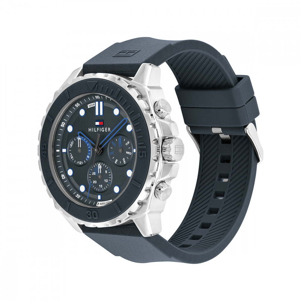 Relógio multifunções masculino com caixa de grande dimensão em aço e bracelete em silicone azul. Mostrador mate com índices marcantes e detalhes de cor. Movimento de quartzo, vidro mineral e resistência à água até 5 ATM. Para looks casuais.