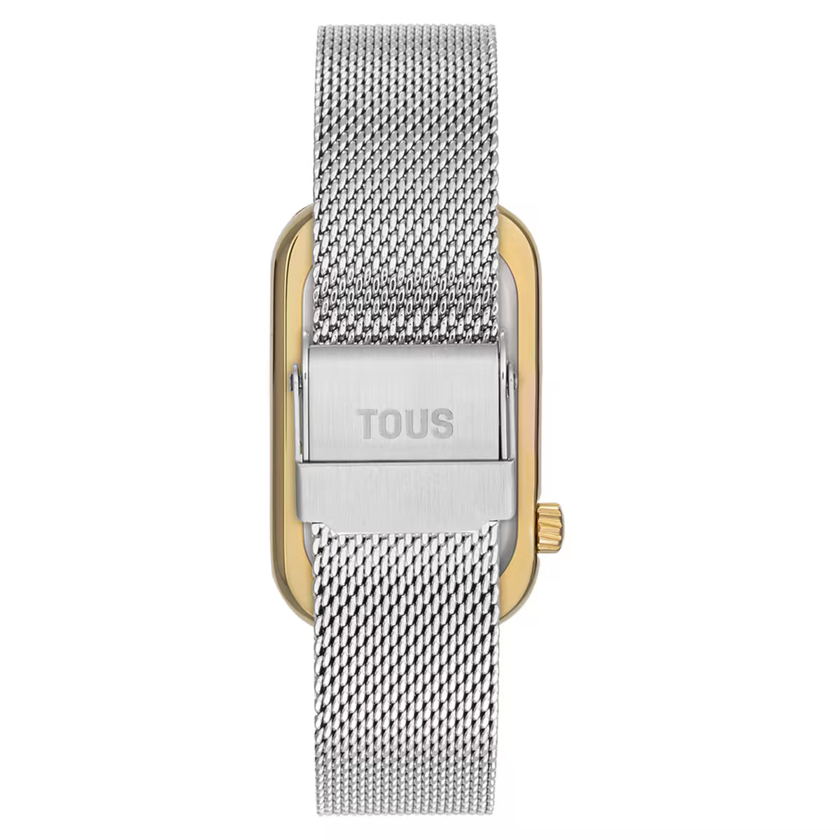 Relógio analógico TOUS T-Band Club com bracelete em aço inoxidável e caixa em aço dourado com a silhueta de um urso no interior. Diâmetro da caixa: 26,5 mm x 44 mm. Mostrador: madrepérola. Funções: horas e minutos. Impermeável: 3 ATM. Bracelete: 16 mm x 16 mm x 87 mm/16 mm x 16 mm x 110 mm. Fecho ajustável com fecho de segurança.