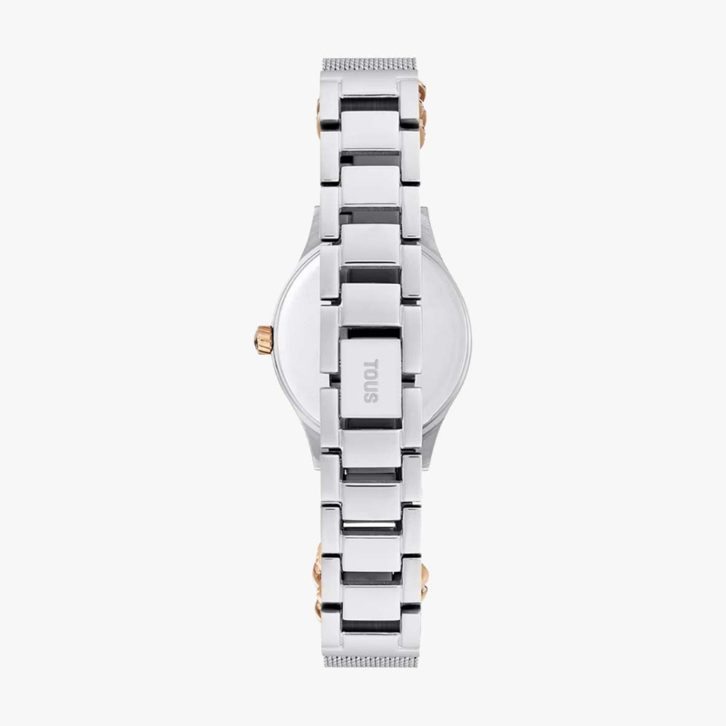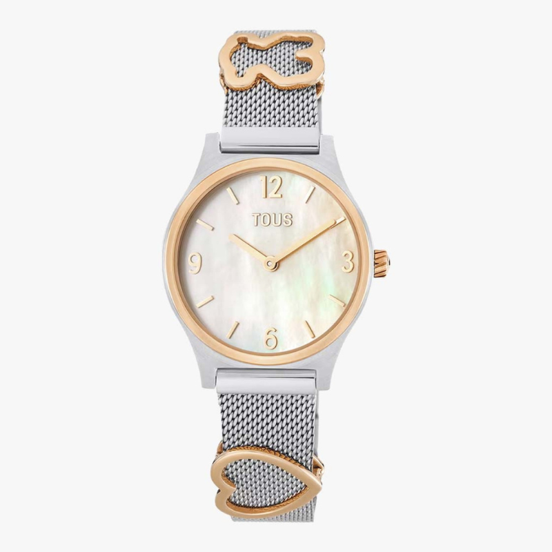 Relógio analógico com caixa de 30mm, mostrador em madrepérola e o uso dos ícones como a esteira, o urso e o coração, fazem deste um relógio emocionante.