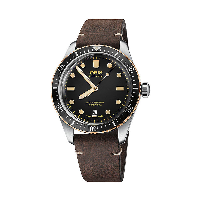 A Oris mergulhou no tempo e tem o prazer de apresentar o relógio Oris Divers Sixty-Five – o renascimento de um icónico relógio de mergulho, que surgiu, pela primeira vez, na coleção da Oris há 50 anos. O novo Oris Divers Sixty-Five partilha a aparência retro do relógio original de 1960, mas foi modernizado com técnicas de fabrico dos relógios do século XXI. A caixa é feita em aço inoxidável anti-corrosão. O vidro de inspiração vintage, curvo como uma bolha, é de cristais de safira resistente a riscos, e tem acabamentos anti-reflexo no interior para reduzir o brilho e melhorar a legibilidade por baixo de água. Peça: Relógios Movimento: Corda Automática Funções: Horas; minutos; segundos; data; ajuste com precisão de segundos; Caixa: Aço inoxidável; Tamanho da Caixa: Ø 40 mm Mostrador: Preto; Indexes e Ponteiros das horas, minutos em Super-LumiNova®; Resistência à água: 100 metros Bracelete: Pele; Fecho: Aço inoxidável; Vidro: Safira, abobadado em ambos os lados, acabamento anti-reflexo no interior