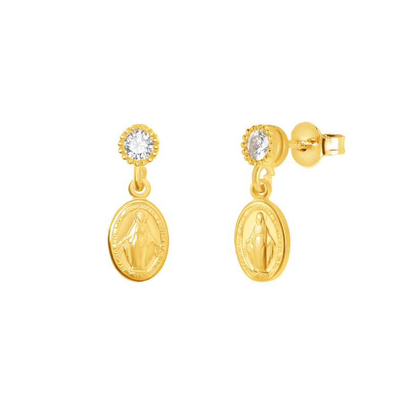 Brincos Miracle em prata de lei, banhados a ouro amarelo, com zircónia. Amuleto religioso que representa a fé. Brincos com imagem Nossa Senhora. Joia para a acompanhar todos os dias. Conheça a nossa coleção de amuletos religiosos!