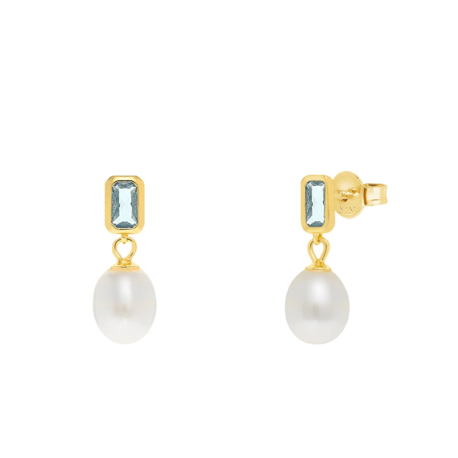 Brincos Ode em prata de lei, banho de ouro com pérola e zircónia azul. Joia marcada pela sua simplicidade, delicadeza e elegância. Perfeito para usar todos os dias.