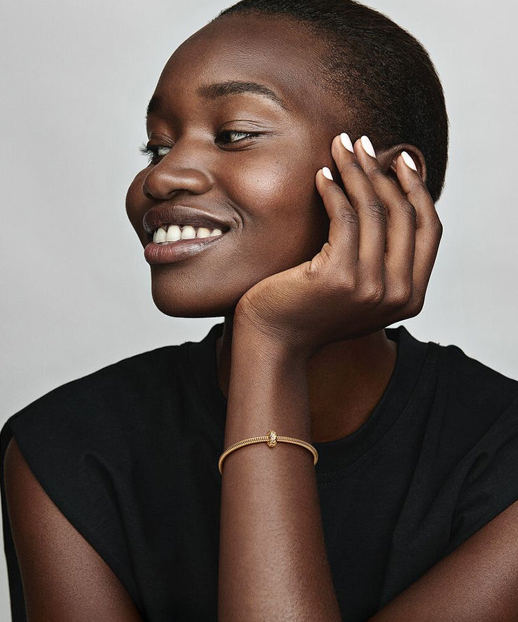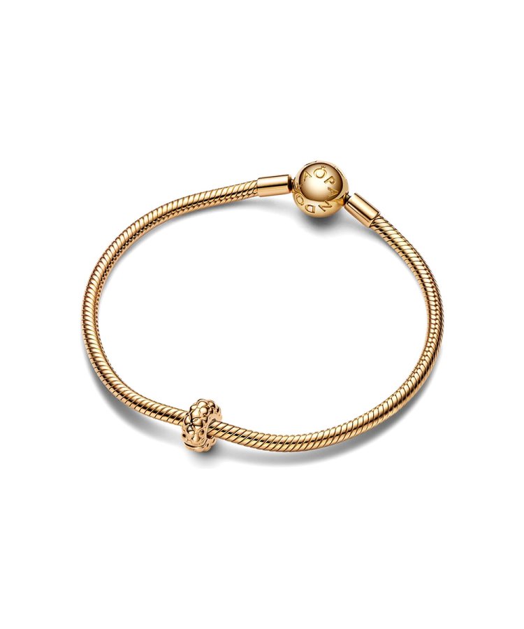 Acrescente ainda mais da icónica textura ao seu look com o Clip Studded Slim. Com a sua textura esférica e piramidal e perfil fino, este clip na nossa liga única revestida a ouro 14k ficará perfeito na sua pulseira Studded, com o seu padrão a ecoar o novo ícone Pandora. A conta apresenta centros de silicone no interior e não pode ser colocada sbre roscas, por isso ficará fixa num único lugar na corrente à medida que se move, enquanto espaça as suas contas. Crie um look com estilo camuflado, adicionando-o à malha studded para um apontamento arrojado.